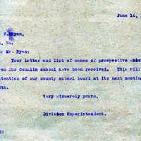letter, Mr. J.F. Ryan, Arcola, Virginia, Division Superintendent, prospective students, Conklin school, education, children, school board, enrollment