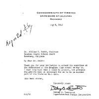 letter, May 8 1942, Dalay Dabney S. Lancaster, Superintendent of Public Instruction, Commonwealth of Virginia, William T. Smith, Chairman, Loudoun County School Board, invitation, dedication, Douglass High School, segregation, education, school events, African American students, professional relationships, communication, state officials, local school board leaders, Virginia, 1940s
