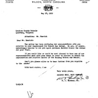 April 27, 1953 correspondence from Superintendent O.L. Emerick soliciting bids for school bus bodies from McDonald and Jenkins, S.J. Meeks' Son, Hackney Brothers, Colonial Motor Sales, Purcellville Motor Company, Windsor Motor Company and Bishop's Service Station. Responding correspondences from Hackney Brothers to O.L. Emerick. (See also EWP 12-4 Yr 1953 Letter from Emerick to Hackney re: New Bus Bids)