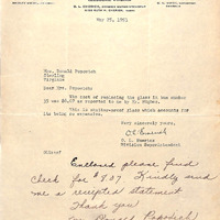 Popovich letter, rock throwing , broken school bus window, check for repair, O.L. Emerick correspondence, receipt of check