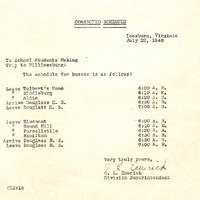 July 22, 1948 correspondence from Superintendent O.L. Emerick of corrected school bus schedule for trip to Williamsburg ("Common Glory" Play). Schedule shows two buses, one starting at Tolbert's home the other starting at Bluemont. Both buses then travel to Douglass High making intermediate stops. Both buses leave Douglass High School (presumably for Williamsburg) at the same time.