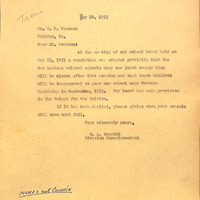 May 14, 1953 correspondence from O. L. Emerick to Mr. W. T. Woodson notifying him of the end of year closing of two, Loudoun colored schools near border between Fairfax and Loudoun and of tuition changes made to transfer students to Fairfax school near Herndon. Assumed the schools were Nokes and Conklin colored schools.