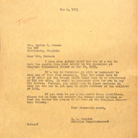 May 2, 1953 correspondence between Superintendent O.L. Emerick and Mrs. Marion Bowman re: using school bus to transport students to and from Douglass Elementary on May 14, 1953 for extra-curricular activities. Emerick outlines the cost and time constraints to use a school bus. Extra-curricular activities could have been a May Day celebration.