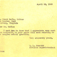 letter, April 22, 1949, O. L. Emerick, Division Superintendent, Leesburg, Virginia, gratitude, Frank Raflo, Editor, Loudoun News, editorial, local school issue, community, education, dialogue, discussions, local media, public opinion, correspondence, social dynamics, political dynamics, journalism, policymaking, public discourse.