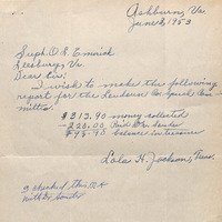 letter, June 3, 1953, D.L. Emerick, Ashburn, Virginia, financial transactions, Londown Co. Speech Committee, Dr. Souder, Lola H. Jackson, treasurer, Dr. Andrew, insight, financial operations, accountability, record-keeping, financial transparency, community groups.