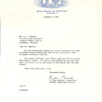 January, 1953, W. Kuhn Barnett, Supervisor, Special Education, Virginia, Letter, Elwood Thomas, academic progress, Crippled Children's Hospital, cumulative record, regular school, Virginia State Board of Education.