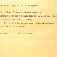 memorandum, Judge J.R.H. Alexander, School Trustee Electoral Board, Virginia, appointment, section 653, John M. Douglass, Robert J. McCray, J.S. Whitmore, educational matters, archival resource, administrative structures, processes, legal requirements, institutional framework, early 20th century.