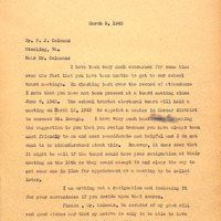 March 3, 1943, letter, school board, P. J. Coleman, Sterling, Virginia, attendance, meetings, resigning, Mercer district, board member, local governance, World War II