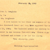 correspondence, February 28, 1943, Division Superintendent, John M. Douglass, Aldie, Virginia, School Trustee, Electoral Board, March 12, 1943, approved meeting, notice sent, Loudoun Times-Mirror, publication, requested, sign, enclosed copy, administrative processes, communication methods, educational governance, Loudoun County, 1940s, coordination, protocol, management.