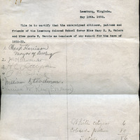This petition, submitted by patrons and supporters of the Leesburg Colored School, requests that Mary E.R. Waters and Annie E. Harris be teachers of record for the 1932-1933 school term. A total of 86 individuals signed the petition 80 identified as "colored" and 6 as white. This petition reflects the community support across racial lines.