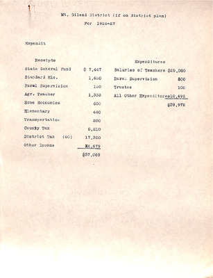EWP 2-5B Yr 1926 Receipts and Expenditures for Mt. Gilead District In the school district of Mt. Gilead in 1926-27, expenditures totaled $37,069, with the majority going towards salaries of teachers at $29,080. Other significant expenses included standard electricity at $1,600, agricultural teacher salaries at $1,333, and rural supervision costs at $1,040. The district also allocated funds for home economics, elementary education, and transportation. The funding for these expenditures came from various sources, including state general funds, county taxes, district taxes, and other income.