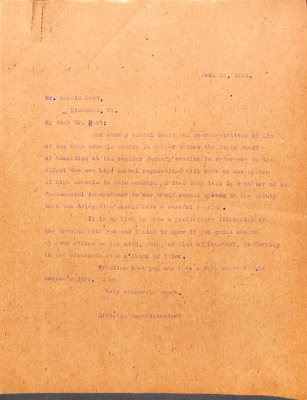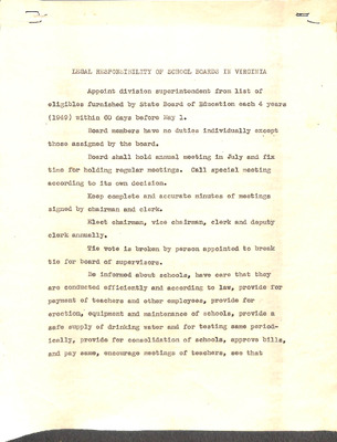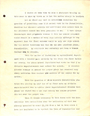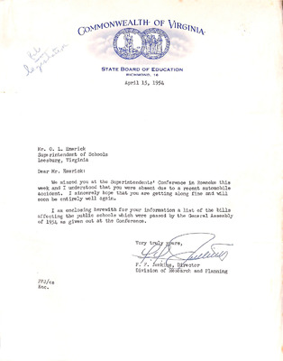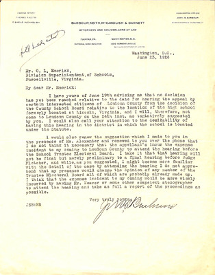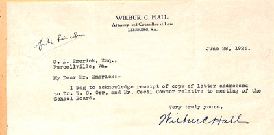 EWP 2-5B Yr 1926 July Correspondence between O.T Emerick and Harris Hart - Decision of Virginia State School Board not to intervene in Lincoln-Purcellville School location issue. Two letters dated July 1926 between Superintendent Emerick and Harris Hart, Superintendent of Public Instruction regarding the location of the Lincoln-Purcellville High School. The issue was brought before the circuit court, which ruled that the school trustee electoral board had jurisdiction. The first letter is addressed to Superintendent Harris Hart dated July 1, 1926 from Superintendent Emerick. (missing second page.) The School Board Trustee electoral Board decided to hear the case on July 9th. The board passed a resolution requesting a committee of 3 make careful study of the matter and make recommendations regarding the school's location. It was advised this committee would have experts whose expenses were already budgeted to cover their expenses. The second letter (O.T Emerick to Harris Hart) The committee of three was made up of Mr. Combs, Mr. Smithey and Mr. Hoke. However, a memorandum report by this committee suggested the dispute was local between these two communities. This lead the Department of Education to decline involvement. (Last 2 pages are duplicate pages.)