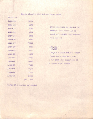 EWP 2-5B Yr 1926 Cost Lincoln High School This document provides a detailed account of the costs associated with Lincoln High School's Department Salaries from 1910 to 1926. The data reveals an increase in expenses over the years, with a total of $73,309 paid out over the sixteen-year period. It is noted that the funds were paid out of public sources, including tuition. The information sheds light on the financial commitment required for the operation of Lincoln High School during this time period. Additionally, there is an estimation of salaries for the 1916-17 period, suggesting the continuous need for budget planning and allocation for educational institutions like Lincoln High School. Overall, this document provides valuable insight into the financial management and expenditure trends in education during the early 20th century.