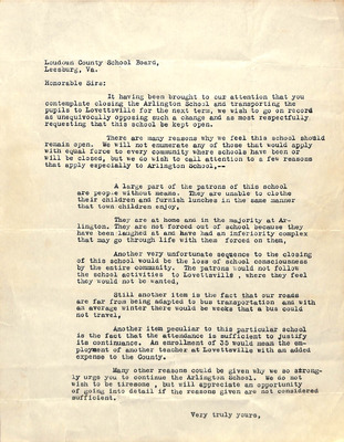 EWP 2-5A Loudoun County Training Center 001 This text is a petition addressed to the Loudoun County School Board, expressing concern over their plan to purchase land adjacent to the colored high school in Leesburg, Virginia. The petitioners argue that the land is needed for the expansion of the nearby Union Cemetery, which serves as a burial ground for the community. They also point out that only a few colored children attending the high school actually live north of Market Street, where the proposed land is located. The petitioners believe that the location of the land is not suitable for the future needs of the colored children's education, given its remote nature and distance from where the majority of the students reside. Ultimately, they request that the School Board reconsider their decision to purchase the land and prioritize the best interests of the colored youth in the community. (Single Page no petitioners list)