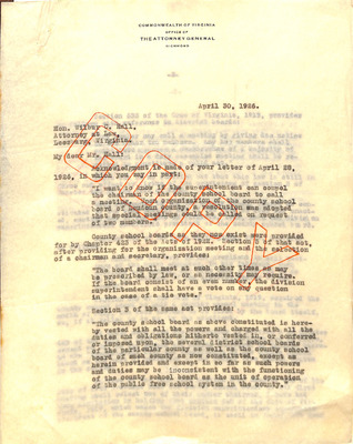 EWP 2.5B Yr 1926 April 30 Can_Super Compell School Board The letter dated April 30, 1926, from the Commonwealth of Virginia Office of the Attorney General to Hon. Wilbur C. Hall, Attorney at Law in Leesburg, Virginia, provides legal advice regarding the powers and duties of the county school board in Loudoun County. The letter references various sections of the Acts of 1922 and the Code of Virginia, 1919, pertaining to the organization, meetings, and authority of the board. It clarifies that the division superintendent has the power to call a meeting of the county school board, as outlined in the relevant legal provisions.