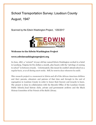 Jan 25, 2017 written introduction to the Edwin Washington Project. August 1947 recommendation to the State Department of Education for Loudoun County white school bus routes for elementary and high schools, with the consolidation of high schools into Loudoun County High School. Information collected pre 1947-48 school year showing distribution of students between the 16 elementary and 4 high schools, also showing those transported by bus. Details of proposed 1947 white school bus routes # 1 - 32 ( Leesburg Elementary, Loudoun County High, Arcola Elementary, Aldie Elementary, Sterling Elementary, Ashburn Elementary, Bluemont Elementary, Round Hill Elementary, Middleburg Elementary, Lincoln Elementary, Purcellville Elementary, Hamilton Elementary, Hillsboro Elementary, Waterford Elementary, Lovettsville Elementary, Lucketts Elementary)