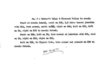 EWP 12-3 Routes Yr 1952 McGraw's Ridge and Pleasant Valley to Arcola Elementary December 8, 1952 School Bus route # 7 from McGraw's ridge to Arcola Elementary and Pleasant Valley to Arcola Elementary.