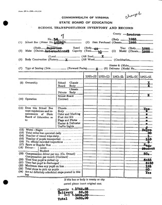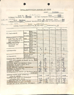 Loudoun County Public School Inventory of school buses driven by White and Negro drivers from 1946-1951. Information includes bus body and chasis type, year purchased, motor serial number, construction type, number passengers, driver age, driver salary… Accident information including property damage costs.
