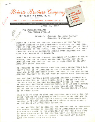 EWP 12-6 Yr 1953 Post High School Training under Roberts Brothers Automotive School 1953 correspondence from Robert Brothers Automotive school to Superintendents of High School Vocational Education. Letter sought interest from Superintedents of High School Vocational Education in boys and young men graduating or about to graduate from their institutions who would continue automotive education in the Roberts Brothers schools. The letter presents this as an opprotunity to learn and get experience in the automotive maintenance industry leading to more secure employment.