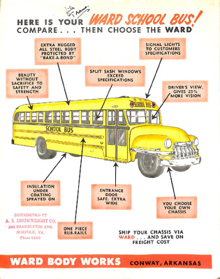 EWP 12-9 Yr 1953 Ward School Bus Body Brochure 1953 Ward School Bus Body sales brochure. School bus body pictures, specifications and features. Distributed by A.S. Drumwright